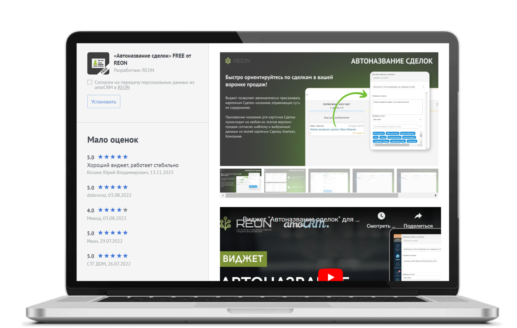Нажмите на кнопку "Установить виджет" или найдите виджет "Автоназвание сделок" FREE от REON в маркетплейсе amoМаркет, отметьте галочкой "Согласен на передачу персональных данных из amoCRM в REON" и нажмите кнопку "Установить".