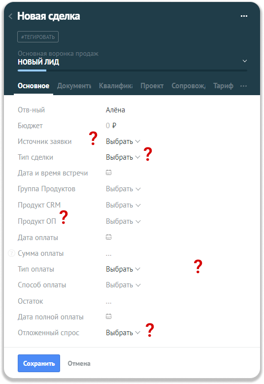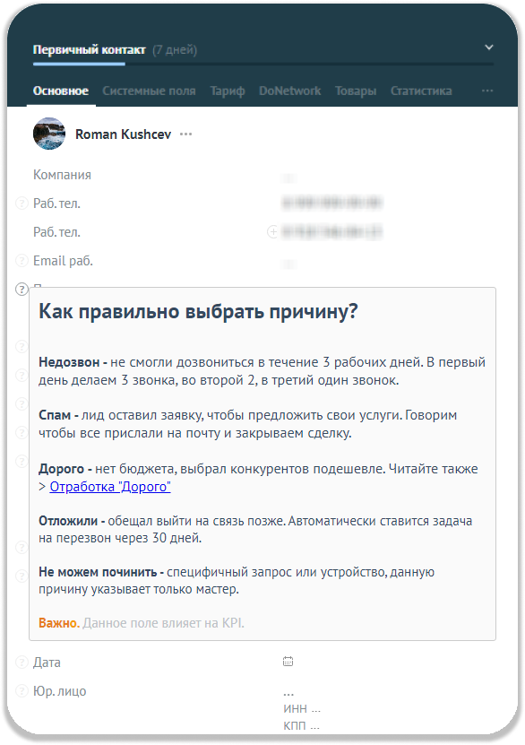Такой большой объем информации сложно усвоить в короткие сроки, особенно, если ранее менеджер не работал в схожих системах. Поэтому в первые месяцы при ведении CRM менеджер либо допускает много ошибок в заполнении карточек Сделка, Контакт и Компания, либо задает вопросы РОПу по заполнению каждой сущности.