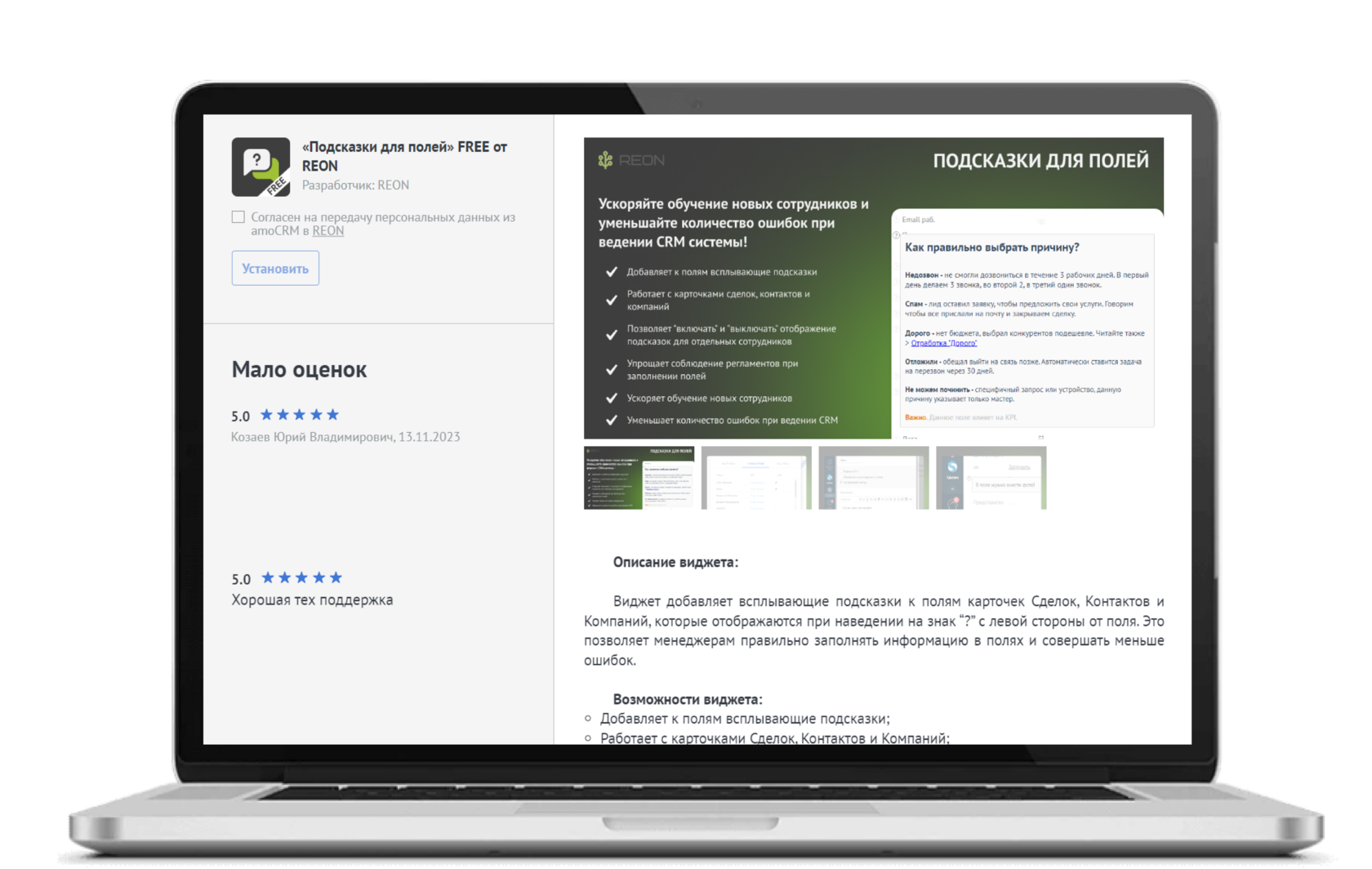 Нажмите на кнопку "Установить виджет" или найдите виджет "Подсказки для полей" FREE от REON в маркетплейсе amoМаркет, отметьте галочкой "Согласен на передачу персональных данных из amoCRM в REON" и нажмите кнопку "Установить".